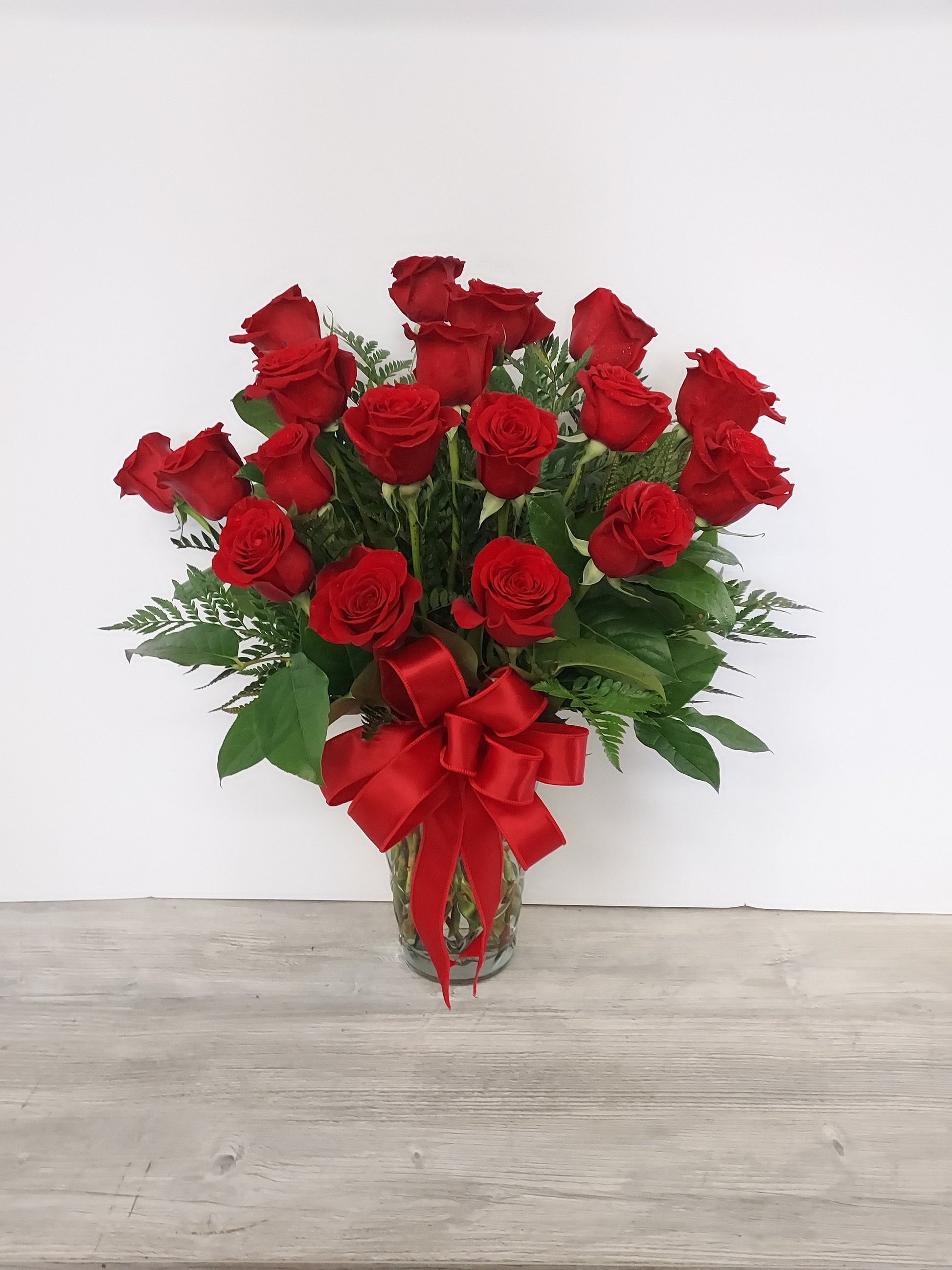 This beautiful arrangement features 18 roses in a vase with natural green accents. Rose color may vary.