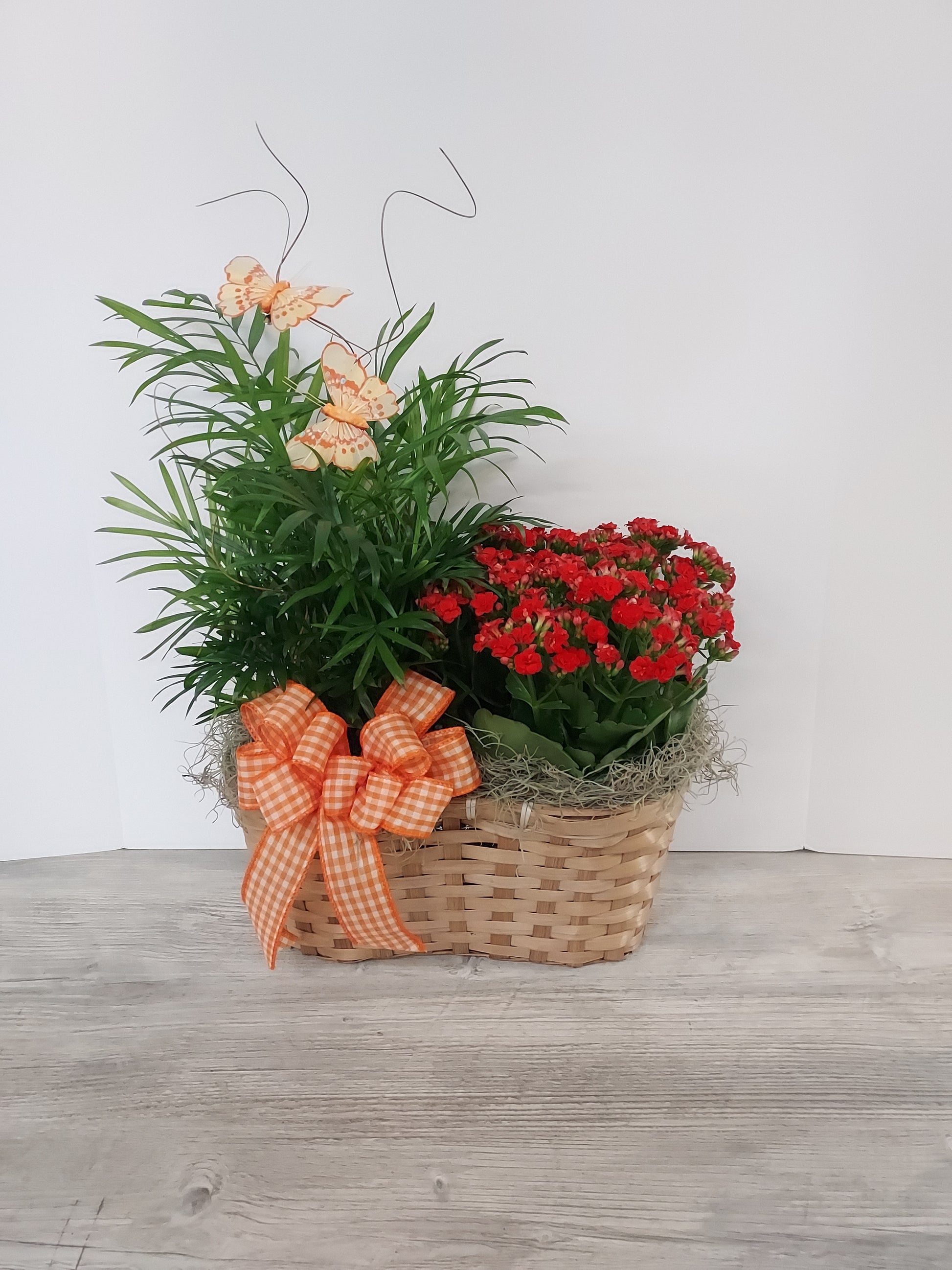 This unique plant basket features a seasonal blooming plant, a green plant and colorful decorations. Plant and decoration choices may vary from picture.